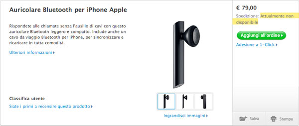 A qualche giorno dalla sparizione dell'Auricolare Bluetooth per iPhone dall'Apple Store online per gli Stati Uniti anche i "responsabili al rallentatore" dell'Apple Store online per l'Italia hanno corretto ed ora non è più possibile ordinare il prodotto.
