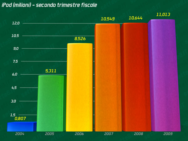 Il player multimediale di Apple ha venduto tra gennaio e marzo 11.013.000 unità (+3% sullo stesso trimestre di un anno prima, con 10.644.000 iPod). In USA (secondo i dati NPD forniti da Apple) l’iPod domina ancora con oltre il 70% del mercato. Bene i mercati europei, australiani e cinesi. L’iPod touch ha praticamente raddoppiato le vendite rispetto ad un anno fa.