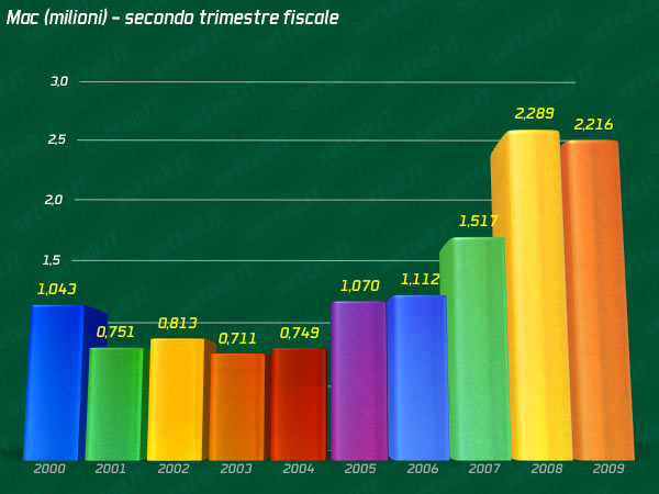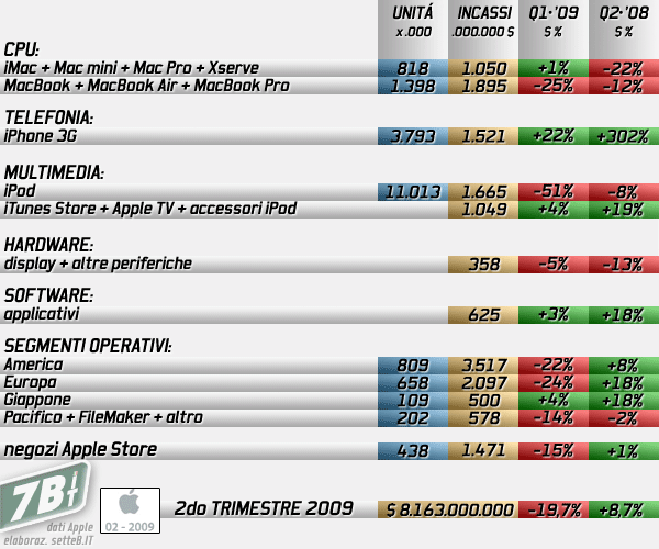 Nel bilancio di tre mesi fa Apple fatturava la cifra record di 10,17 miliardi di dollari (11,8 miliardi non-GAAP) ed incassava un netto di 1,61 miliardi di dollari (2,3 miliardi non-GAAP), mentre nel secondo trimestre fiscale del 2008 il fatturato era di 7,512 miliardi di dollari con un utile di 1,045 miliardi di dollari.