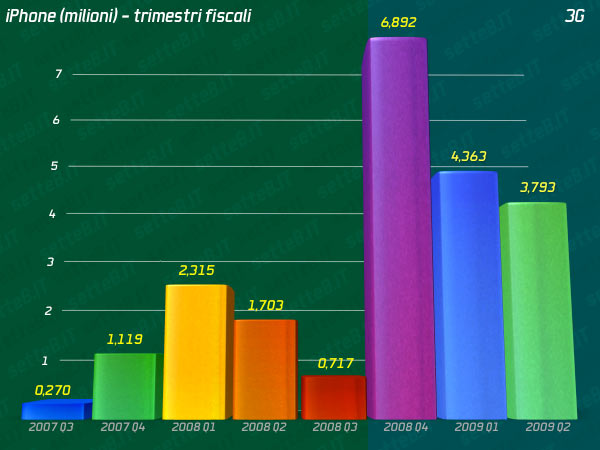 Nel secondo trimestre fiscale del 2009 Apple ha venduto in tutto il mondo 3.793.000 iPhone 3G, già sappiamo che AT&T in USA ne ha attivati 1,6 milioni (un ottimo partner per Apple, oltre che il maggiore che usa il GSM, la tecnologia mondiale a cui Apple puntava per fare un solo modello di iPhone). Sarebbe un incomparabile +123% rispetto al secondo trimestre del 2008, quando Apple vendeva ancora la prima generazione dell’iPhone in pochi paesi.