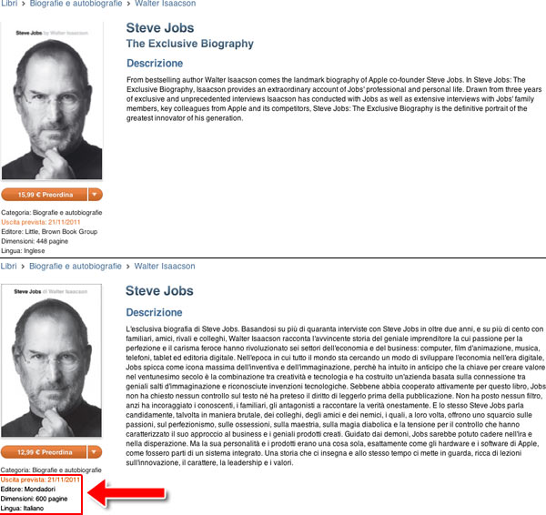 Di conseguenza è apparso su iBookstore (pensate che c’è qualcuno che lo chiama iBook Store, iBooks Store, iBookStore e via così) anche “Steve Jobs di Walter Isaacson” con 600 pagine per 13 euro, quando nelle ore precedenti si trovava solo “Steve Jobs by Walter Isaacson” con 448 pagine per 16 euro. Il primo è la versione in italiano ed il secondo quello pubblicato dall’editore britannico Little, Brown Book Group (Hachette UK), ovviamente in inglese.