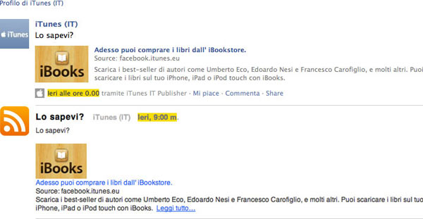 A proposito di iBookstore Italia, ci chiedevamo se Apple avrebbe mai dato una notizia ufficiale. Eccola in “grande stile” con 2 righe su Facebook e relativo feed RSS, che titolavano nel weekend “lo sapevi?”. Verrebbe da rispondere “sì, ma non certo grazie a voi”. Gli orari degli annunci hanno i fusi orari che cozzano che è un piacere e che nessuno si degna di correggere da sempre. Un altro tassello per capire la differenza abissale con cui Apple tratta gli Stati Uniti e la massa di tutti gli altri paesi.
