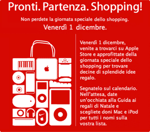 La "Giornata speciale dello shopping" viene così promozionata da Apple: Natale è tempo di doni e il prossimo venerdì è il giorno ideale per acquistarli. Decine di splendide idee regalo a prezzi esclusivi solo per un giorno. A partire dagli iPod fino ai Mac, Apple Store ha il regalo perfetto per ognuno sulla vostra lista di Natale e, ricordate, Apple Store offre l'incisione gratuita su tutti gli iPod.