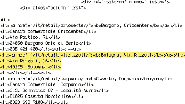 Aggiornamento del 12/09/2011: il lettore Alessandro ci suggerisce di guardare nel codice della pagina, per scoprire che il negozio di Bologna è ancora in lista, come potete vedere qui sotto. Grazie per la segnalazione, anche di altri siti che millantano esclusive ma che hanno pubblicato la notizia dopo di noi. Siamo superiori a questi mezzucci. Solo in serata il banner con data ed ora d’inaugurazione del negozio bolognese è stato fatto sparire “rapidamente” da Apple, per poi doverlo rimettere online magari tra poche ore.