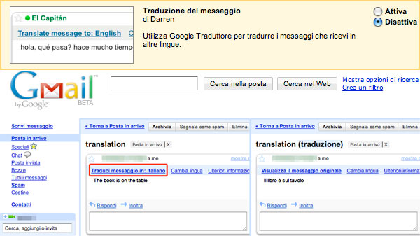 Sergey Brin l'aveva già anticipato un paio di settimane fa, il servizio si può abilitare nelle impostazioni/labs e poi comparirà un link "traduci messaggio in" prima del testo di un nuovo messaggio recapitato nella casella della webmail gratuita di Google.