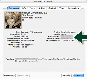 Da iTunes il pannello delle informazioni della canzone indica l'"account name" e anche via Terminal il Mac è in grado di mostrare l'account registrato nei database di Apple per il file M4A in questione.