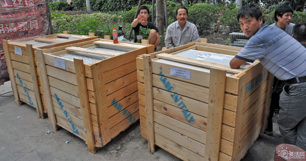 Ecco le casse con i mega-piastrelloni da 75/80 centimetri quadrati che sono in attesa di essere messi sul pavimento del nuovo negozio, con tanto di scritta “made in Italy” sulla confezione in legno.