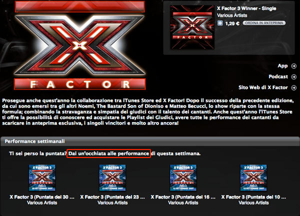 Nessuna novità se anche in questa nuova stagione televisiva 2009/2010 è ripartito il programma di RaiDue “X-Factor“, il quale ha una parentesi su iTunes Store Italia per vendere le canzoni dei “talenti” che vi partecipano, prima che Sony Music li metta sotto contratto.