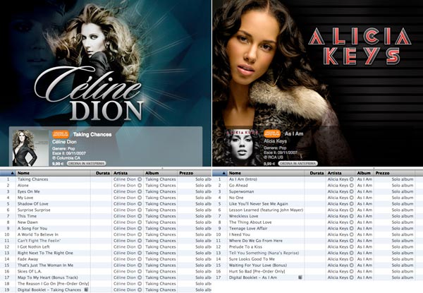 La prossima settimana arriveranno i nuovi dischi di Céline Dion "Talking chances" ed Alicia Keys "As I am", esattamente venerdì 9 novembre. Su iTunes Store Italia, se ordinati in anticipo, si potranno ottenere 1 canzone bonus e 1 esclusiva per il mesedimo prezzo di 10 euro.