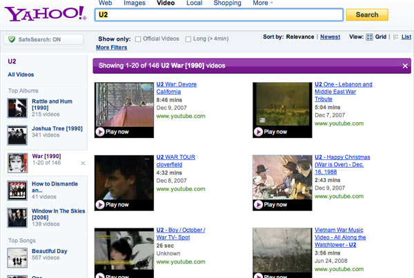 Ecco l'esempio con i videoclip degli U2, come suggerito da Yahoo! stessa, tutti o in grandissima percentuale si riferiscono a YouTube.