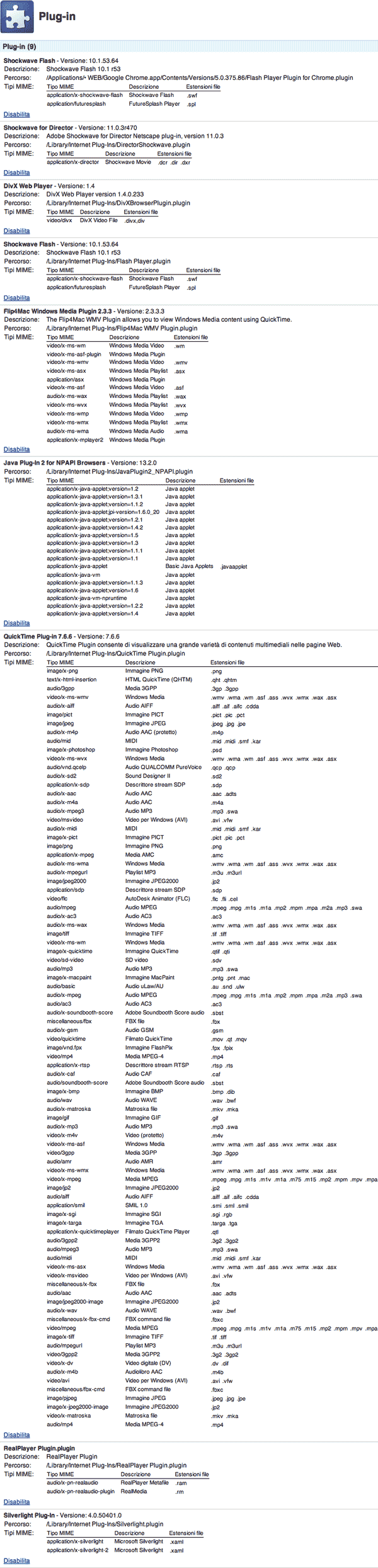 Google permette di controllare tutti i plug-in installati nel browser, conoscere quali estensioni di file gestiscono ed eventualmente di disabilitarli. Tutto digitando “about:plugins” (senza virgolette) nella barra degli indirizzi.