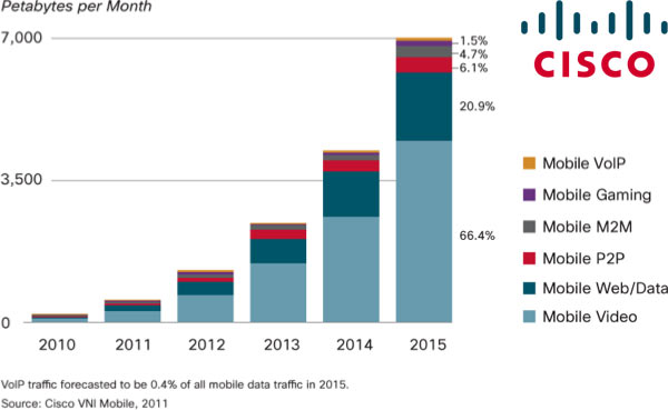 Un dato reale è già l’aumento del 159% del traffico avvenuto dal 2009 al 2010 su rete mobile (237 petabyte al mese, una media di 65 megabyte al mese per ogni dispositivo) e questo equivale a 3 volte tanto di tutto il traffico Internet nell’anno 2000. Entro il 2015 questo si moltiplicherà però di ben 26 volte fino a raggiungere 6,3 exabyte al mese (6,3 mld di GB/mese o 75 mld di GB/anno, con una media di 1.118 MB/mese per dispositivo), equivalente a tutta la popolazione del globo, bambini compresi, che inviano 1.000 SMS ogni secondo.