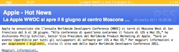Aggiornamento del 30/03/2011: dopo aver saputo che tutti i biglietti sono stati venduti in meno di 10 ore, non è un’idea geniale che il feed RSS delle notizie di Apple pubblichi l’annuncio con oltre 2 giorni di ritardo.