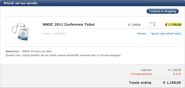 I biglietti saranno venduti molto rapidamente, nel 2010 sono bastati 8 giorni. Il mese in più che Apple usa per avvertire gli interessati servirà ad allungare i tempi? Il prezzo è rimasto uguale a quello del 2010 (1.600 dollari a testa, ovvero +300 sul 2009), 1.200 euro per la nostra valuta.
