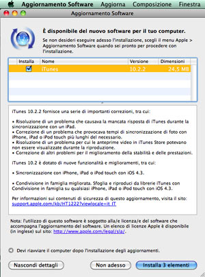La versione iTunes 10.2.2 (24,5 MB) risolve un problema che causava la mancata risposta di iTunes durante la sincronizzazione con un iPad, corregge un problema che provocava tempi di sincronizzazione di foto con i dispositivi iOS più lunghi del necessario, risolve un problema per cui le anteprime video in iTunes Store potevano non essere visualizzate durante la riproduzione ed infine corregge vari imprecisati bug.