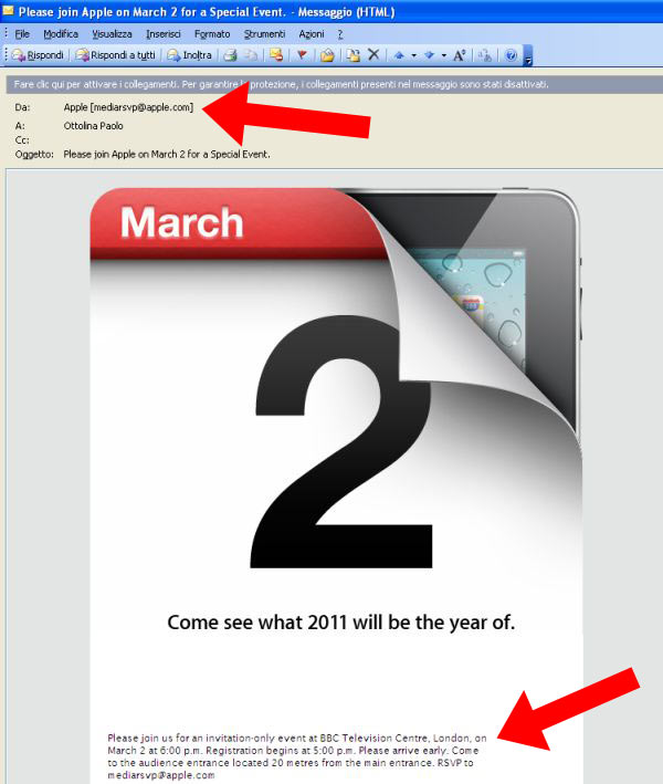 Aggiornamento del 23/02/2011: grazie al Corriere della Sera, che pubblica interamente l’invito per la stampa europea (senza coprire, come ha fatto il resto del mondo, le informazioni riservate), tutti sanno che la presentazione di mercoledì prossimo sarà trasmessa via satellite a Londra.