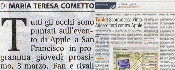 Aggiornamento del 28/02/2011: il supplemento CorrierEconomia esce oggi con questo articolo firmato dalla newyorkese Maria Teresa Cometto, dove si crede che il giorno della presentazione sarà giovedì 3 marzo, eppure sembra evidente che l’invito rechi un enorme 2 marzo. Occhiali nuovi o un bel calendario appeso al muro?