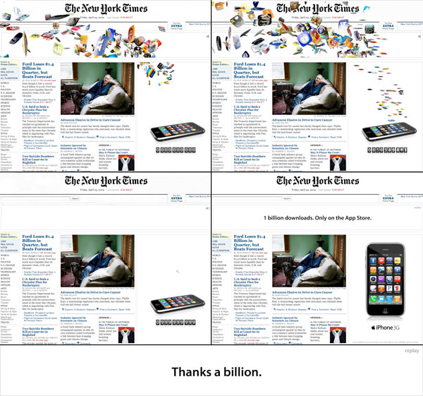 Aggiornamento del 24/04/2009: i festeggiamenti sono scattati sul New York Times ed altri siti a grande visibilità, con questi banner interattivi. La numerazione dei download parte da zero e rapidamente arriva a 999.999.999, poi si aggiunge un ultimo file ed il record è fatto.