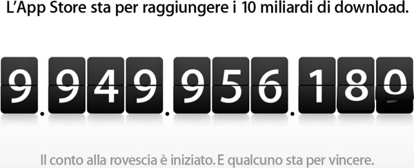 Il “conto alla rovescia” (come lo chiama Apple, anche se non va al contrario) è partito venerdì scorso e mette in palio un credito iTunes/App/MacApp Store di 10.000 dollari (o 7.580 euro) per chi riuscirà a scaricare la prima applicazione dopo che il counter avrà segnato 9.999.999.999. Si possono scaricare da App Store software a pagamento o gratis, ma si può partecipare anche 25 volte al giorno fornendo i propri dati anagrafici.