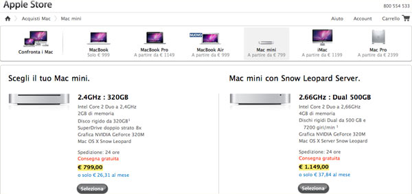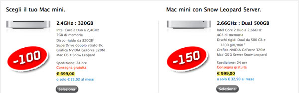 Apple ha ribassato il prezzo dei Mac mini, ora costano 700 e 1.000 euro, rispettivamente per la versione client con drive ottico e per la versione server senza drive ottico e con doppio hard disk.