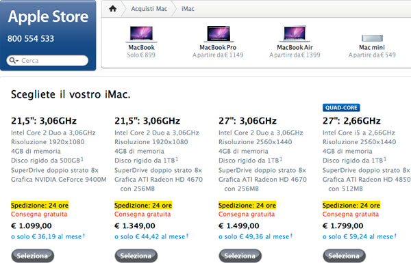 Ebbene ora l’Apple Store indica per tutti gli iMac disponibili nel nostro paese consegne entro le 24 ore dall’ordine.