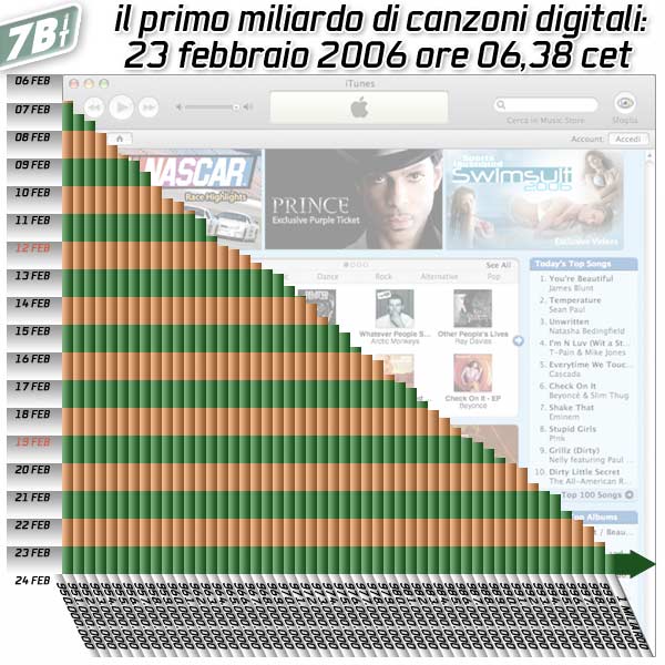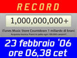 Pietra miliare dell’era multimediale: iTMS ha venduto in 1.032 giorni 1 miliardo di canzoni. Apple ne ha vendute 1 milione ogni giorno. Rush finale, all’alba obiettivo raggiunto e superato. “Un miliardo di ragioni per festeggiare” dicono a Cupertino.