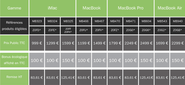 Si possono comperare fino ad un massimo di dieci nuovi Mac per cliente. E' possibile portare ai rivenditori d'oltralpe sia PC che Mac, funzionanti o rotti. L'utente avrà la sicurezza che tali ruderi saranno riciclati con tutti i crismi. Si spera che non facciano la stessa fine dei televisori di Philips (che nel frattempo si è pentita).