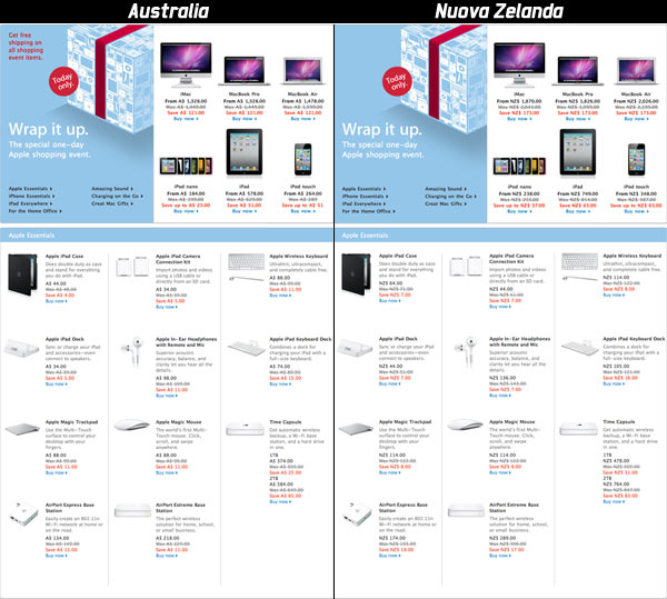 Ma quanto si potrà risparmiare? Non tantissimo, lo abbiamo imparato durante le precedenti edizioni. I prezzi in Australia e Nuova Zelanda hanno visto tagli similari al listino, limitandoci ai soli prodotti Apple ecco cosa sarà lecito attendersi anche da noi dopo la mezzanotte (forse all’1):