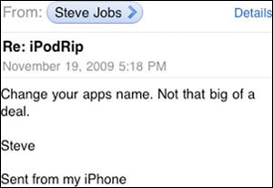 Ebbene Jobs appoggia completamente gli interventi dei legali e non ha alcuna intenzione di concedere alcunché (eccezion fatta, evidentemente, per i migliaia di siti, forum e negozi che contengono nel nome i marchi registrati di Apple), la sua risposta è stata infatti: "Cambia il nome della tua applicazione. Non è proprio un così grande affare". Facendo intendere che mettersi contro l'ufficio legale non conviene a nessuno.