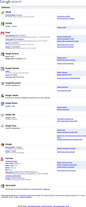 La gente di tutto il mondo si fida di Google ma questo pannello di controllo completo (una ventina di servizi, da Gmail a YouTube passando per Reader o Talk, accanto ne vedete alcuni) darà maggiormente il senso dei dati personali che sono raccolti ed associati ad un certo account.