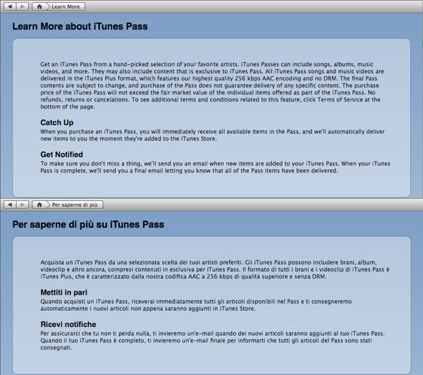 Aggiornamento del 24/02/2009: abbiamo contattato EMI per conferme sulla disponibilità dell'iTunes Pass in altri paesi e ci hanno detto che sarà attivo solo in USA.