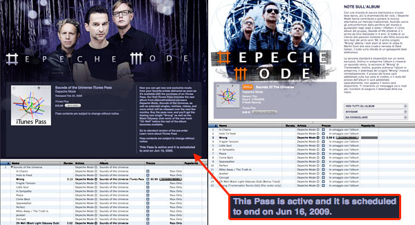 Si comincia con "Sounds of the Universe" dei Depeche Mode (dopo un'assenza di quattro anni), ma solo negli Stati Uniti, lo stesso album in Italia non ha un prezzo maggiorato (come in USA a 19 dollari) e non si trova alcun accenno ad iTunes Pass.