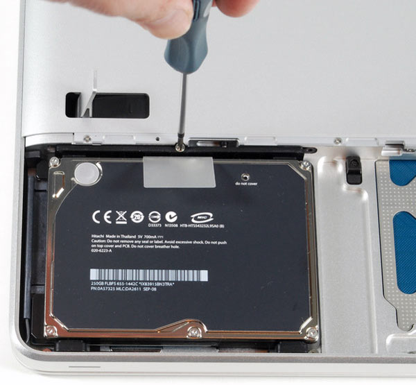 L'hard disk (Hitachi) si estrae svitando un solo fermo. Il tipo di connettore usato è il S-ATA già impiegato nei precedenti modelli.