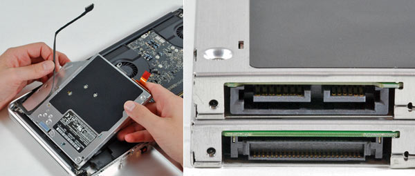 Il SuperDrive scelto da Apple è un modello Panasonic (come spesso accade) ma il drive ottico ora utilizza l'interfaccia S-ATA. Accanto vediamo la differenza con il precedente connettore.