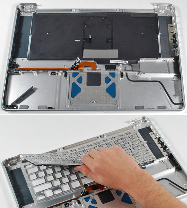 A seguire vedete lo chassis in alluminio completamente vuoto e come si estrae la tastiera retro-illuminata, che è fissata da parecchie piccole viti.