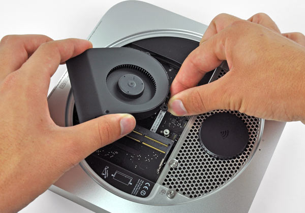 Una volta tolto il coperchio inferiore gommato si affaccia quello che sembra il Mac mini precedente, ma vedremo che cambia qualcosa. Come primo intervento si toglie la ventola.