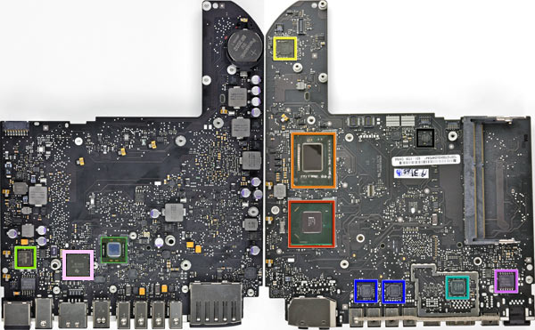 Riconosciamo sulla scheda logica i chip scelti a Cupertino: Intel BD82HM65 (rosso), Intel V116A068N (arancio), ISL6364 (giallo), SMSC 1428-7 (nero), SMSC USB2513B (blu), Parade PS8171 (verde smeraldo), Delta 8904C-F (fuxia), controller FireWire Texas Instruments (rosa) e controller SD/Ethernet Broadcom BCM57765 (giallo fosforescente).
