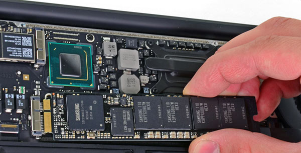 Si legge in modo evidente sulla scheda delle memorie NAND (ovvero un SSD – Solid State Drive in forma anomala) che si tratta ancora di Samsung, almeno in questo caso. Non ci sono certezze che i fornitori possano essere multipli. Nulla è saldato, quindi potenzialmente sostituibile.