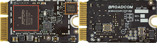 Dopo aver scollegato le antenne e svitato il fermo, ecco il processore Broadcom BCM4322 (solo per l’iMac recentemente aggiornato Apple si era stranamente servita di Atheros) per il Wi-Fi 802.11n e poi la piccola componente BCM20702 dedicata a Bluetooth 4 (e standard precedenti). Novità assoluta per Apple con lo standard PAN a basso consumo.