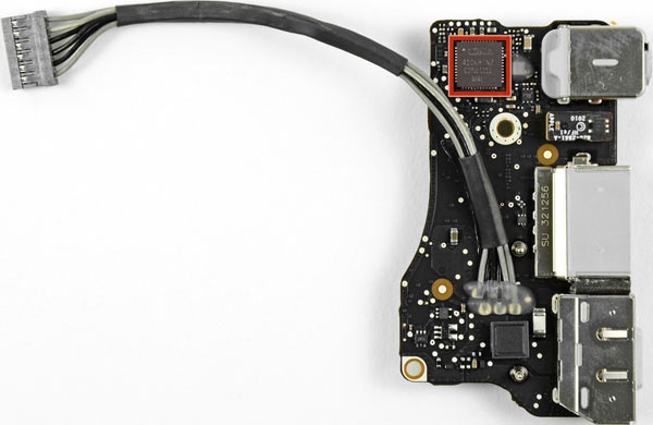 Qui troviamo la MagSafe per l’alimentazione , la USB 2, e l’ingresso dal microfono più uscita audio, queste ultime controllate dal processore Cirrus 4206BCNZ già visto in precedenza.