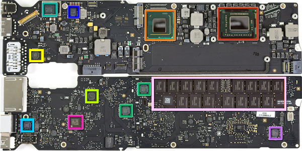 Riconosciamo i chip usati: Intel Core i5-2557M (rosso), controller Intel (arancio), controller slot SD Genesys Logic (giallo), DSL2310 (verde smeraldo), Linear Technology 3857 (blu), memoria RAM Hynix 4 GB (rosa), F2117LP (fuxia), TP551980 (giallo fosforescente), controller UDB SMSC (verde chiaro), Parade PS8301 (azzurro) e Maxim 15092G (viola).