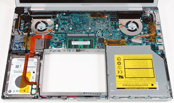 Con competenza i tecnici di questo negozio hanno aperto il nuovo portatile di Apple per scoprirne tutti i segreti. RAM da 1 GB e hard disk Fujitsu da 120 GB fanno parte della dotazione di questo computer (sembra che il modello da 160 GB sia uno con tecnologia perpendicolare invece che longitudinale, ndr). Sul SuperDrive c'è stampata la sigla UJ-857C mentre il System Profiler indica UJ-857D. Nessun cambiamento di batteria (60 W e 10,8 V).