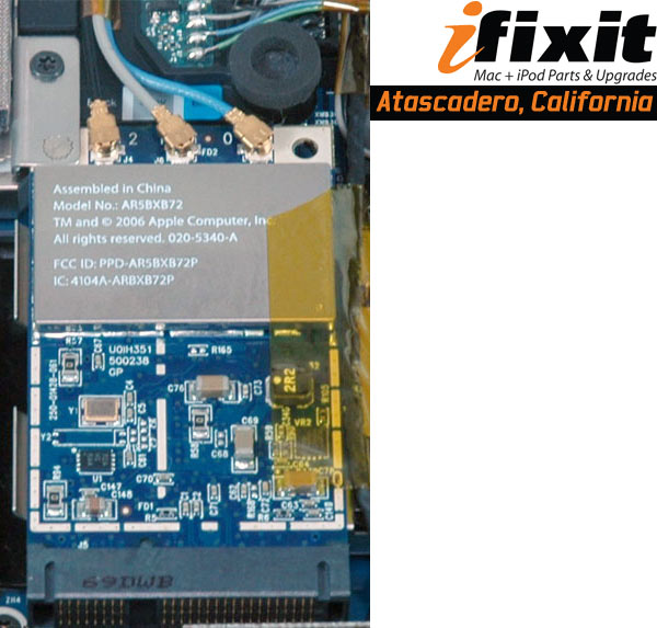 Ecco qui sotto invece il nuovo modulo AirPort, un sistema Wi-Fi che, come abbiamo già avuto modo di sottolineare, oltre a 802.11a/g (e quindi 802.11b) supporta il draft di 802.11n, si notino i tre cavi delle antenne.