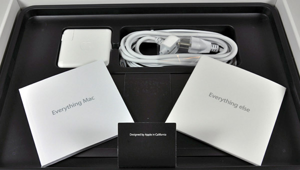 Ecco il contenuto della confezione, oltre al computer: l'alimentatore da 85 W con cavo elettrico, due DVD con il software, il manuale cartaceo e la pezza nera per pulire lo schermo di vetro lucido.