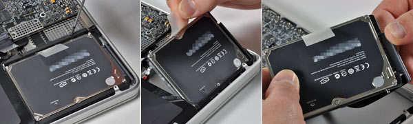 Solo due viti ancorano il supporto dell'hard disk da 2,5" allo chassis, si estrae il disco tirando la linguetta bianca. Poi si deve scollegare il cavo S-ATA.