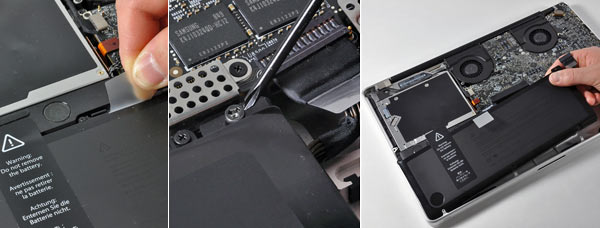 Andando tranquillamente contro ogni avvertimento di Apple, iFixit ora stacca la batteria dal computer. Tre viti speciali a tre punte fissano l'accumulatore di energia (7,3 V/95 Wh) dalle generose dimensioni (pesa 570 grammi, il 20% di tutto il laptop) allo chassis. Sorpresa, è molto facile sostituirla, se non fosse che lo speciale cacciaviti è molto poco comune. Tuttavia Apple vuole che si spendano lo stesso 179 euro nel momento che questa non renderà più.