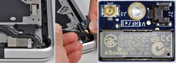 Dietro il drive ottico si cela il chip Bluetooth, si tratta dell'Anatel BCM93046MD_MINI. Le componenti Wi-Fi della scheda ed antenna AirPort sono state celate molto bene da Apple.
