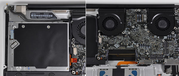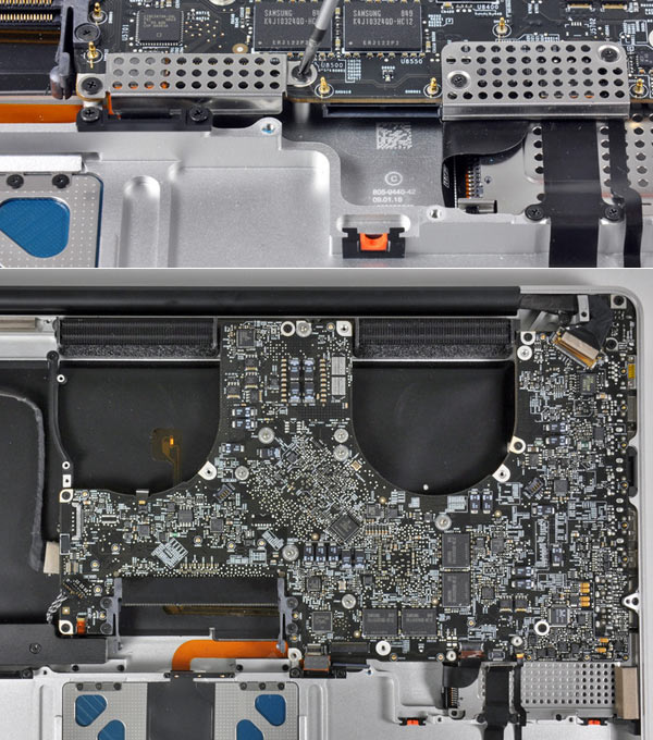 A sinistra possiamo vedere il SuperDrive 8x (DVD±R DL/DVD±RW/CD-RW) ed a destra la scheda logica, i quattro chip più grandi disposti ad "L" sono i moduli di memoria video prodotti da Samsung per il chipset nVidia 9600M GT.