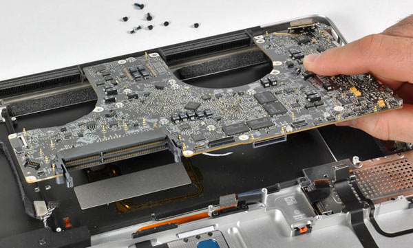 Dal MacBook Pro 17" i tecnici californiani di iFixit possono ora estrarre la scheda logica sagomata.