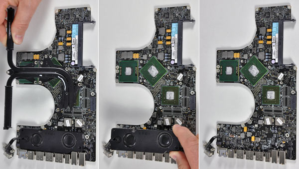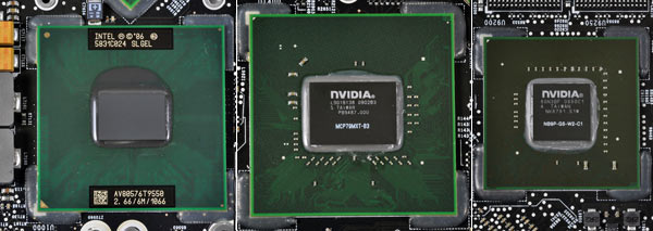 Da sinistra a destra gli ingrandimenti dei tre chip principali del computer: Intel 5831C024 @ 2,66 GHz con 6 MB di cache L2 e bus a 1.066 MHz; nVidia L901B138; nVidia 50N3BF.